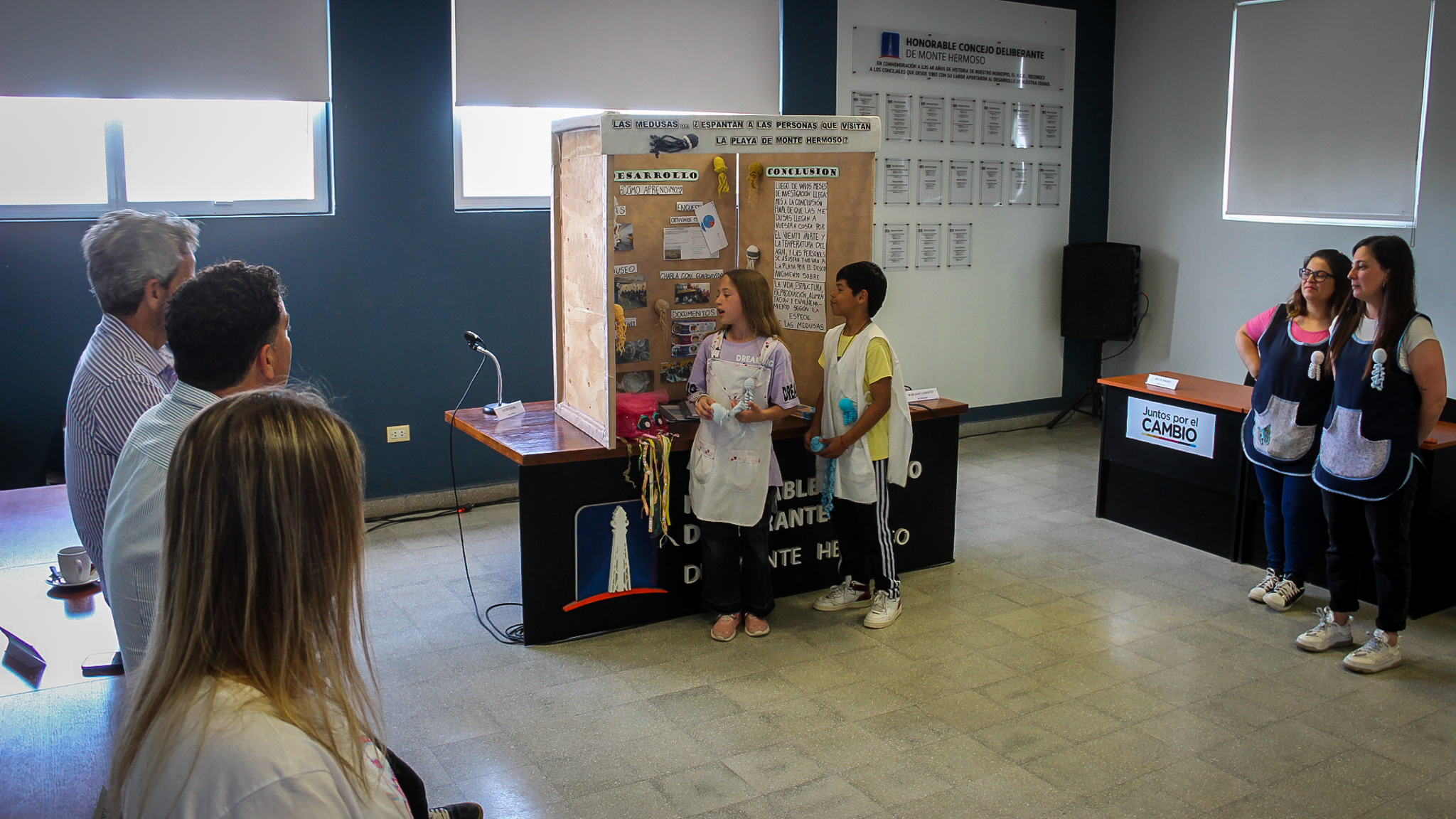 Con la presencia del intendente Hernán Arranz, estudiantes de 5° de la Escuela Primaria N°2 estuvieron con su stand en el Recinto del Honorable Concejo Deliberante (HCD) para contarles a las autoridades presentes sobre su proyecto denominado “Las medusas ¿espantan a las personas que visitan la playa de Monte Hermoso?, con el que ganaron su pase a la final nacional que se llevará a cabo del 4 al 8 de noviembre en Villa Giardino, Córdoba.