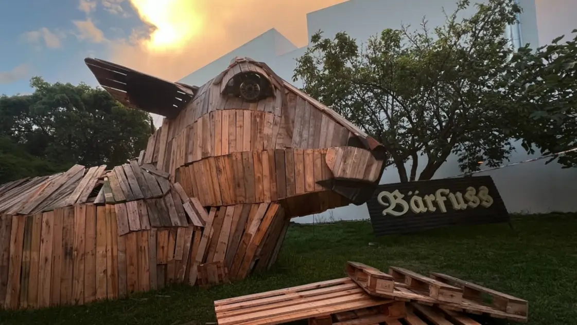 El artista pigüense Manu Sahuet vuelve a captar la atención del mundo del arte con una creación tan original como imponente: una oveja gigante de madera construida íntegramente con pallets reciclados. La obra, que mide 7 metros de alto, 10 de largo y 5 de ancho, fue encargada por una cervecería de La Plata con motivo de su 15° aniversario.
